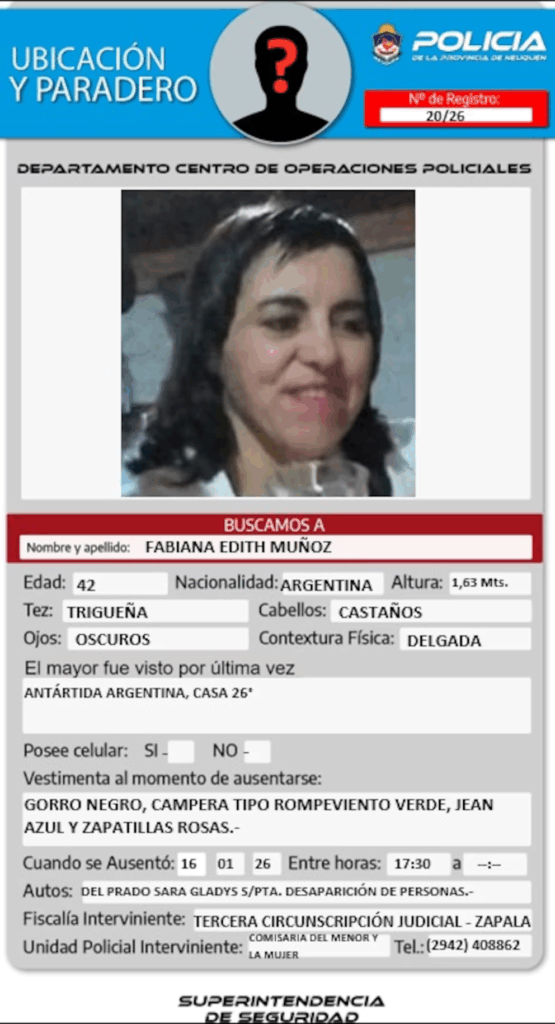Según los datos comunicados por las autoridades, Fabiana fue vista por última vez el viernes en su casa, ubicada en la calle Antártida Argentina, casa 26, de la ciudad de Zapala. Se estima que habría salido de la propiedad cerca de las 17:30 horas.