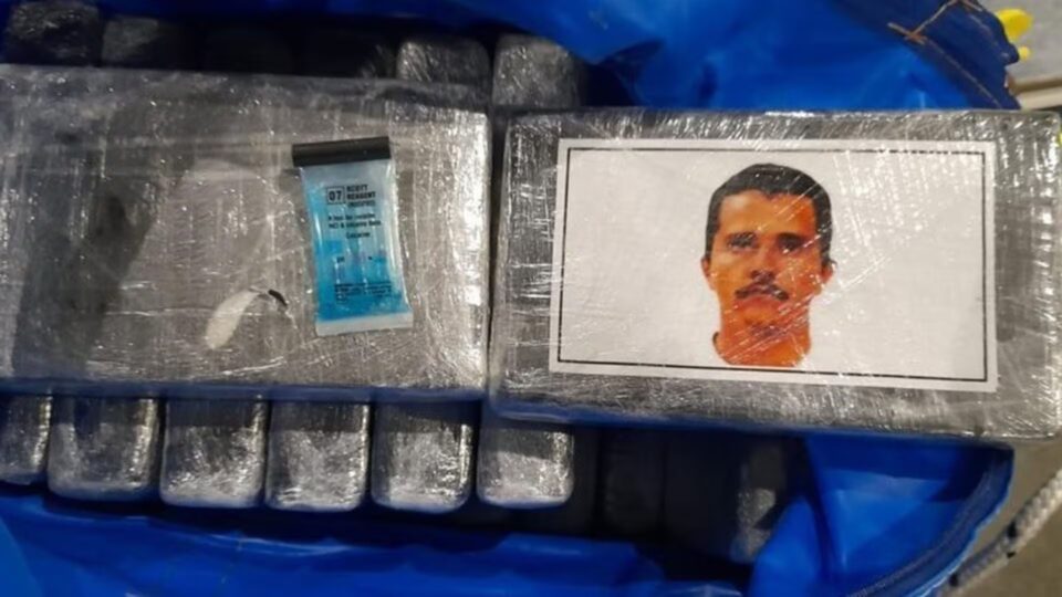 Paquetes de droga incautados junto a una imagen de Bozidar Ratkovic, el narco bosnio cuya caída se dio en Argentina y operaba en la Hidrovía. (.)