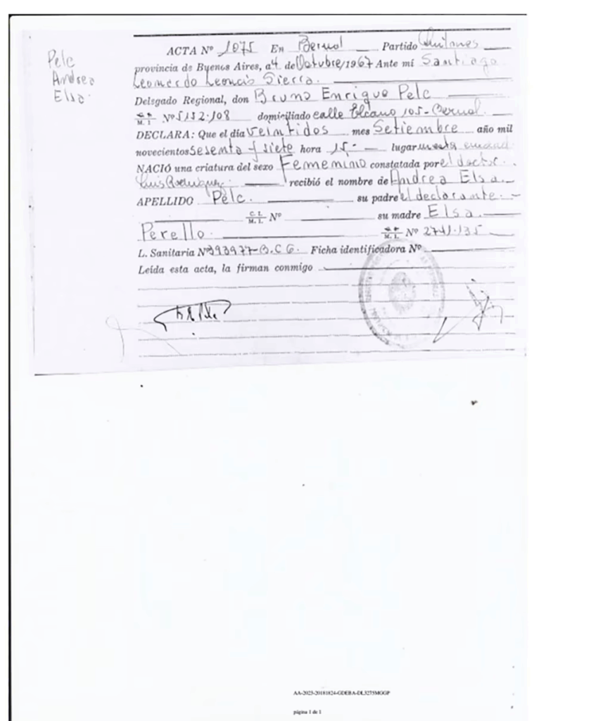 Aunque a Bruno y a Elsa les preguntó si había sido adoptada, Andrea sabe que fue apropiada. “Apropiación es todo lo que vos tomás que no te pertenece”, define. Esa convicción tomó forma concreta cuando comprobó que su partida de nacimiento era falsa. La había firmado un médico allegado a la familia, Luis Rodríguez, quien consignó como fecha de nacimiento el día de su propio cumpleaños: el 22 de septiembre. “Mi mamá siempre me decía: ‘Naciste el mismo día que el tío Luis, sos un regalo’”, recuerda. A eso se sumó otro dato clave: Bruno era estéril.