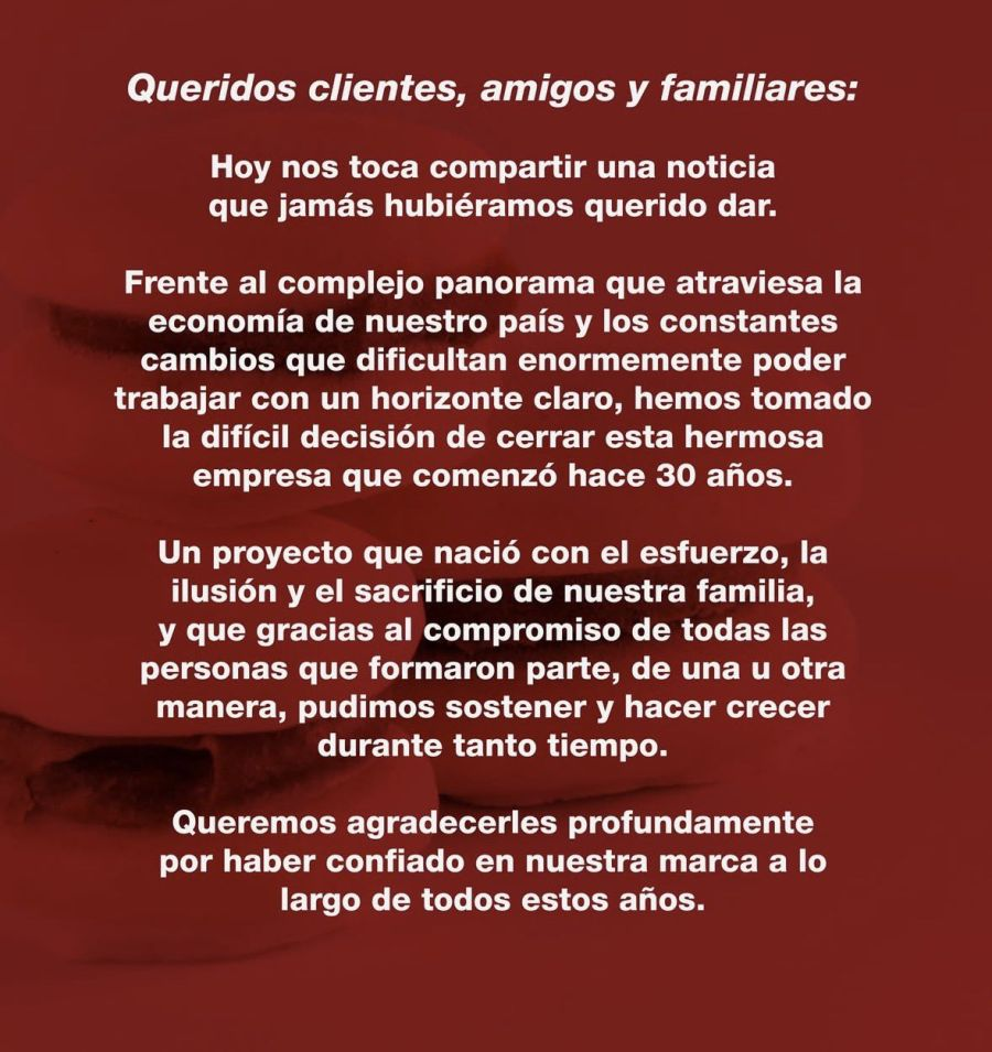 La empresa familiar había sido fundada en 1992, luego abrió distintas bocas de expendio en los centros comerciales de la capital cordobesa y llegó a emplear a una veintena de personas en el mejor momento de la firma. Finalmente, y tras no poder sortear un complejo escenario como sí lo habían hecho en 2016, cuando casi se encuentra con el mismo desenlace bajo la presidencia de Mauricio Macri, este miércoles anunció su cierre.