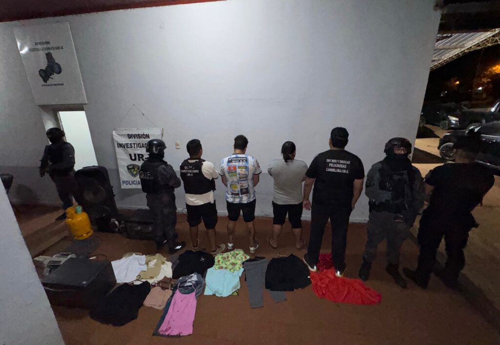 El segundo allanamiento se llevó a cabo en una vivienda del barrio Ñu Porá, sobre la calle Irupé casi Saltos del Moconá. Allí fue detenido Alfredo Omar M. (40), y en el lugar se incautaron prendas de vestir nuevas en paquetes, un equipo de música, un rifle de aire comprimido y módulos de telefonía, todos elementos que formarían parte del circuito de bienes sustraídos que la organización utilizaba para financiar sus actividades ilícitas.