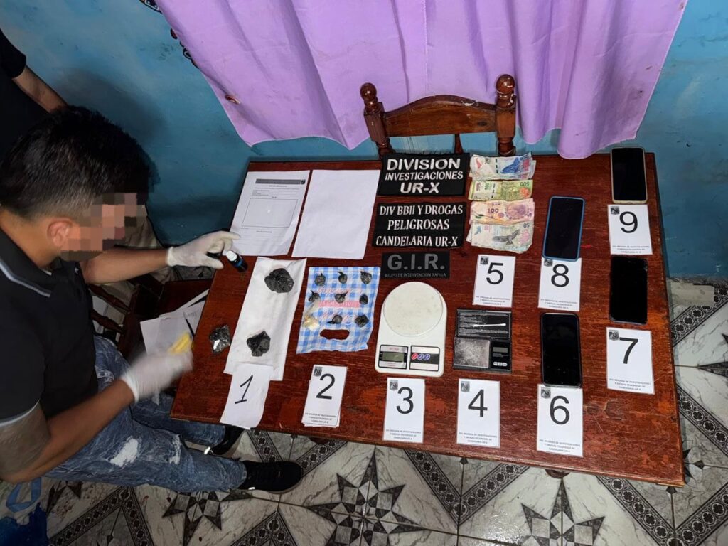 Un operativo realizado anoche por la División Investigaciones de la Unidad Regional X, permitió desarticular dos puntos de venta de drogas y acopio de bienes robados, que operaban en distintos sectores de Garupá. Durante las intervenciones simultáneas se detuvo a dos hombres y se confirmó que un tercer implicado ya había sido aprehendido días atrás en el marco de la misma investigación. Además, se secuestró cocaína valuada en casi 6 millones de pesos, junto con una importante cantidad de objetos robados.