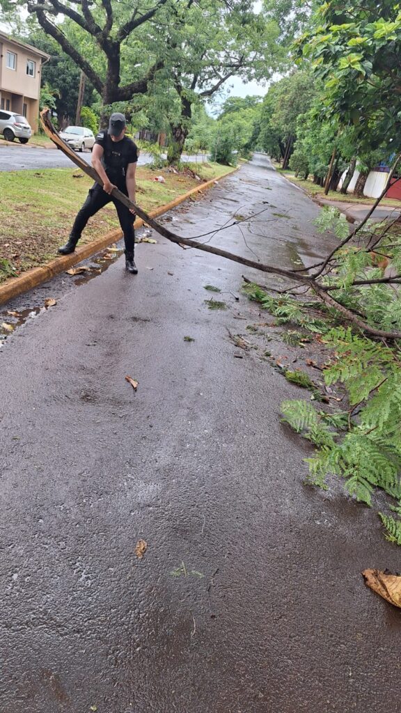 En la tarde del domingo, la Policía de Misiones llevó adelante un amplio operativo de prevención y asistencia en diversos barrios de la ciudad de Posadas, a raíz del temporal que provocó caídas de árboles y ramas, desprendimientos de techos y daños en tendidos eléctricos, generando interrupciones en el tránsito y diversos riesgos en la vía pública.