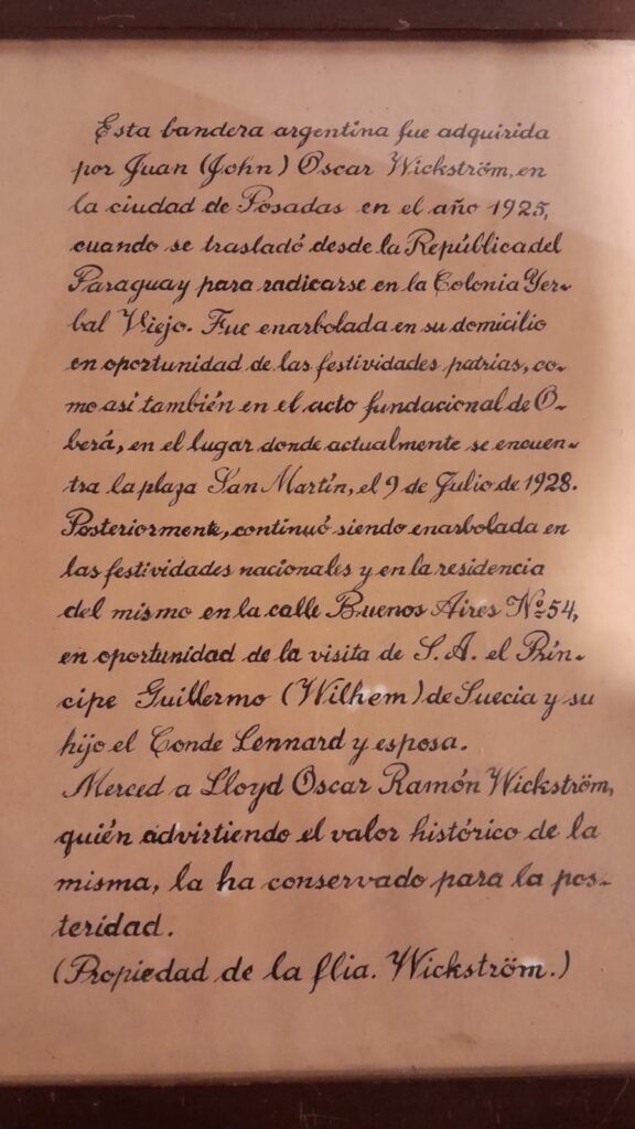 La enseña vino de la mano de Cristina Stevenson, directora de Turismo y Cultura de Oberá, junto a la documentación que la acompaña. “Esta bandera argentina fue adquirida por Juan (John) Oscar Wickström, en la ciudad de Posadas en el año 1925, cuando se trasladó desde la República del Paraguay para radicarse en la Colonia Yerbal Viejo. Fue enarbolada en su domicilio en oportunidad de las festividades patrias, como así también en el acto fundacional de Oberá (en el lugar donde actualmente se encuentra la plaza San Martin), el 9 de julio de 1928”, dice el documento.