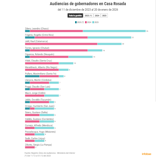 Le sigue el mandatario entrerriano,Rogelio Frigerio, quien participó de 22 audiencias en Balcarce 50: dos en diciembre de 2023, 11 en 2024 y 9 en 2025. Los funcionarios a los que más visitó fueron Catalán y Francos, 5 veces a cada uno.