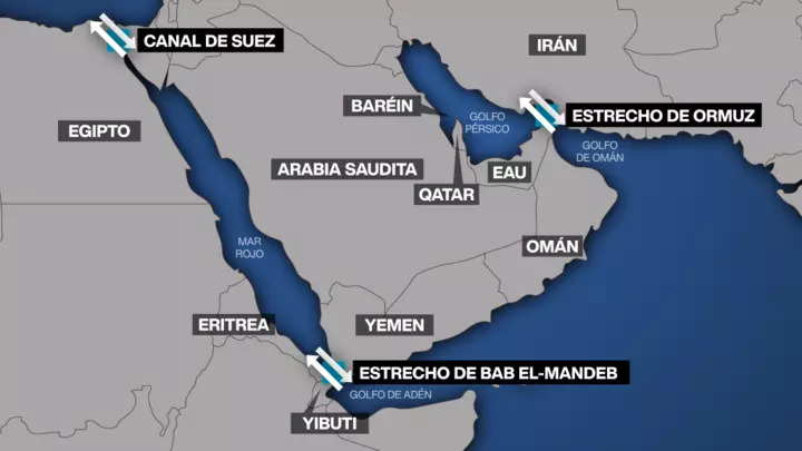 Por este trecho de apenas 25 km de ancho, que da al norte con Yemen y al sur con Yibuti transita el 10% del petróleo mundial. Sumado al 20% que ha quedado atrapado en el cuello de botella de Ormuz, casi un tercio del suministro energético global quedaría suspendido.