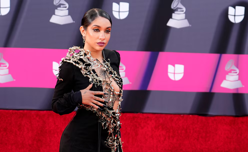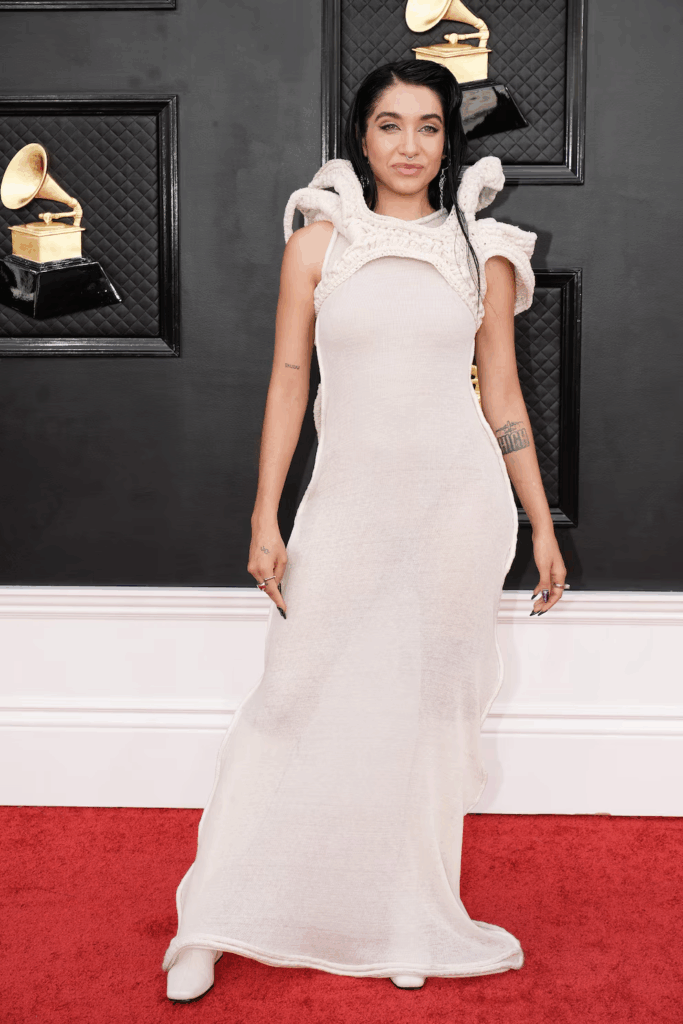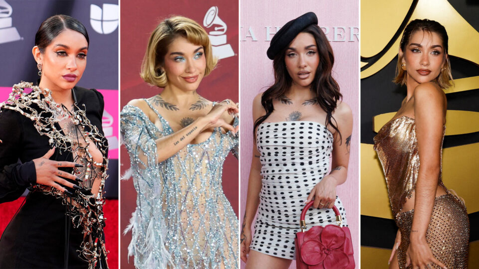 En otra edición de los Latin Grammy, apareció con un vestido largo blanco translúcido, de textura gruesa en hombros y escote. El corte ceñido y el cabello peinado hacia atrás acompañaron el efecto etéreo sobre la alfombra.