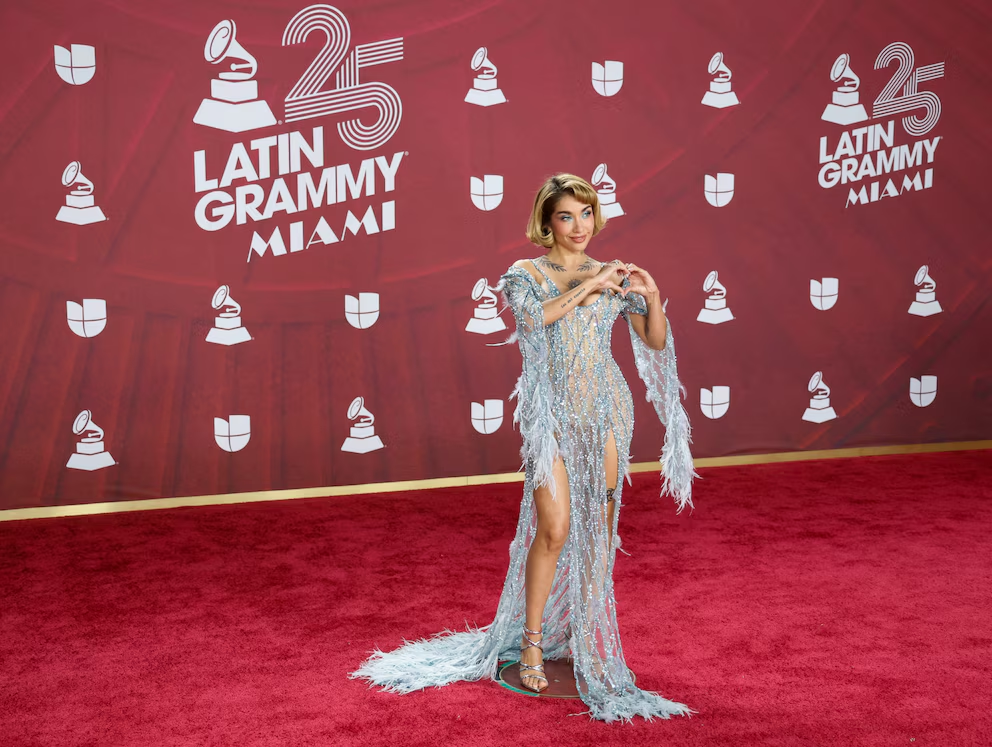 En la alfombra de los Latin Grammy, impactó con un vestido largo celeste de transparencias, brillo y flecos. El escote profundo y la abertura lateral dejaron ver la pierna, mientras las sandalias plateadas y el cabello corto con ondas completaron la escena de gala.