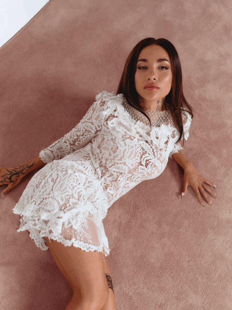 En una producción fotográfica, posó recostada con un conjunto de encaje blanco de manga larga y shorts cortos, decorado con flores. Las transparencias dejaron ver la piel y el maquillaje suave sumó intimidad a la escena.