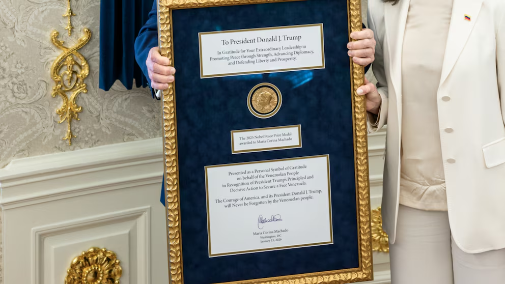 Machado entregó la medalla del Premio Nobel de la Paz enmarcada con un mensaje de “gratitud” del pueblo venezolano por sus acciones para lograr “su libertad”.
