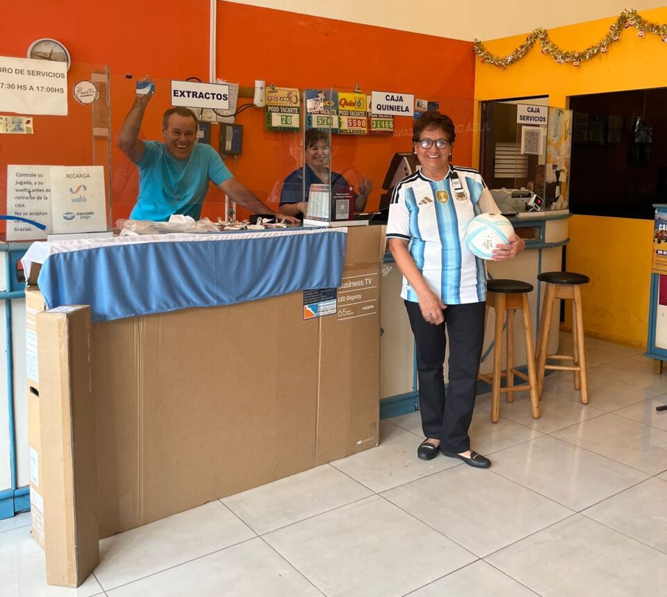 María García, de Puerto Iguazú, es la ganadora del primer kit mundialista que sorteó La Tombolita el pasado 1 de abril y se alzó el premio de un televisor de 65 pulgadas, una barra de sonido, una camiseta de la selección, una pelota y una bandera de Argentina, un combo ideal para alentar a la Selección Argentina, en víspera del Mundial 2026.
