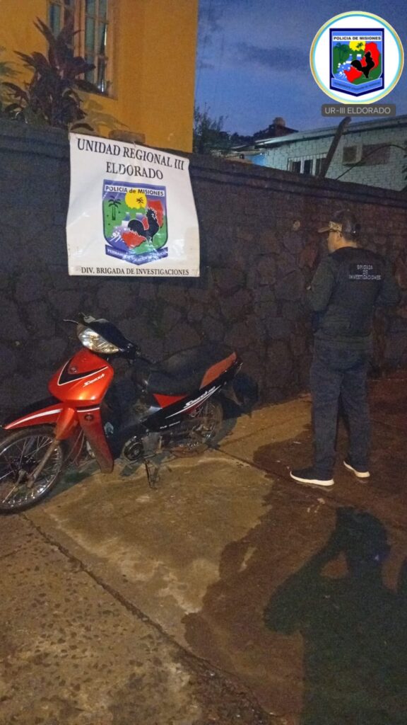 En Eldorado, la División Investigaciones de la Unidad Regional III recuperó una motocicleta Gilera Smash 110 cc denunciada como robada en junio por una vecina del kilómetro 18. Luego de un minucioso trabajo de campo, el rodado fue hallado en una zona de malezas por lo que se procedió a su secuestro y traslado a la sede policial, quedando la causa parcialmente esclarecida mientras prosiguen las tareas para identificar al autor.