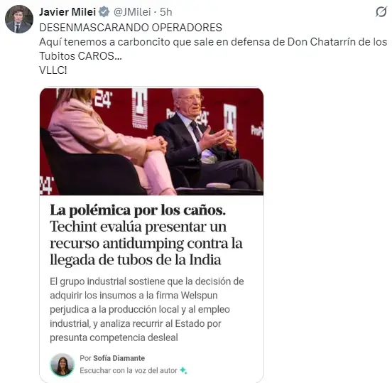 En ese mismo mensaje, Milei apuntó de manera directa contra Paolo Rocca, al referirse a quienes salen "en defensa de Don Chatarrín de los tubitos CAROS", en una alusión explícita al CEO del grupo Techint.