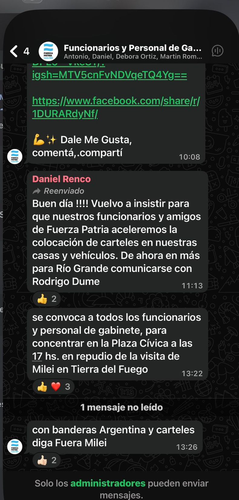 "Difundieron por Whatsapp los focos de encuentro instando a los funcionarios, que cobran el sueldo gracias a los pagadores de impuestos de Tierra del Fuego, a abandonar sus puestos de trabajo y concurrir a un escrache", añadieron los voceros del oficialismo y buscaron respaldar su postura con la imagen de un chat.