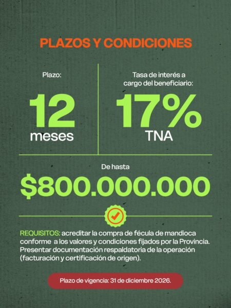 Como requisito, los beneficiarios deberán acreditar la compra de fécula de mandioca conforme a los valores y condiciones fijados por la provincia, mediante la presentación de documentación respaldatoria de la operación, incluyendo facturación y certificación de origen.