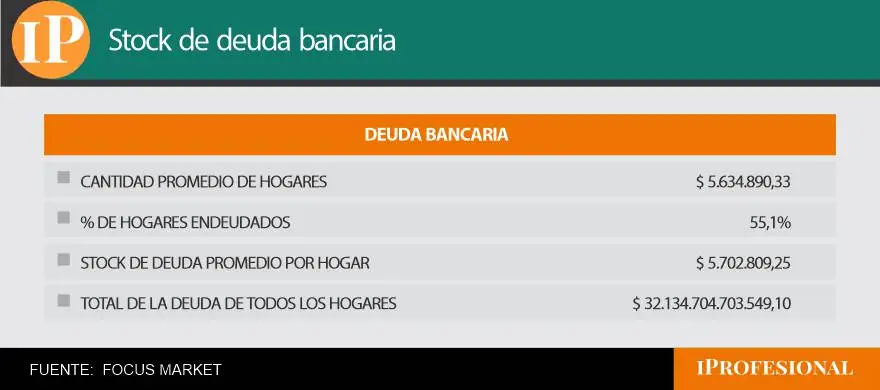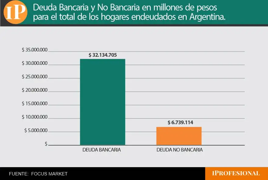 Los hogares argentinos acumulan hoy más de $39 billones en deuda: $32,1 billones en deuda bancaria y $6,9 billones en deuda no bancaria. La diferencia en los montos promedio por hogar es elocuente: mientras la deuda bancaria promedia $5.702.809 por hogar endeudado, la no bancaria se ubica en $1.149.431.