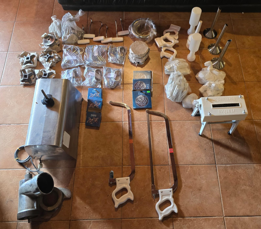 Asimismo, en continuidad con la investigación y mediante orden judicial emitida por el Juzgado de Instrucción N.º 7, se realizó un allanamiento en una vivienda del barrio Villa Longa. En el lugar se secuestraron numerosos elementos vinculados al rubro cárnico, entre ellos máquinas y accesorios para embutidos, cuchillas de picadoras de carne, serruchos, engranajes y documentaciones de compra.