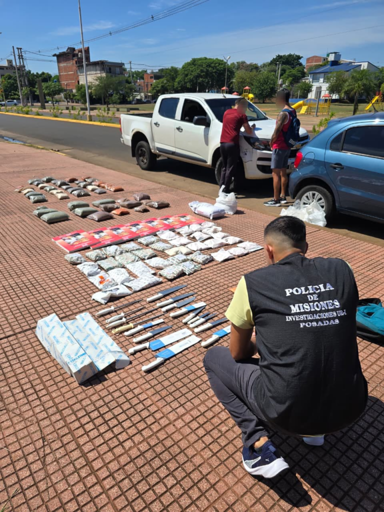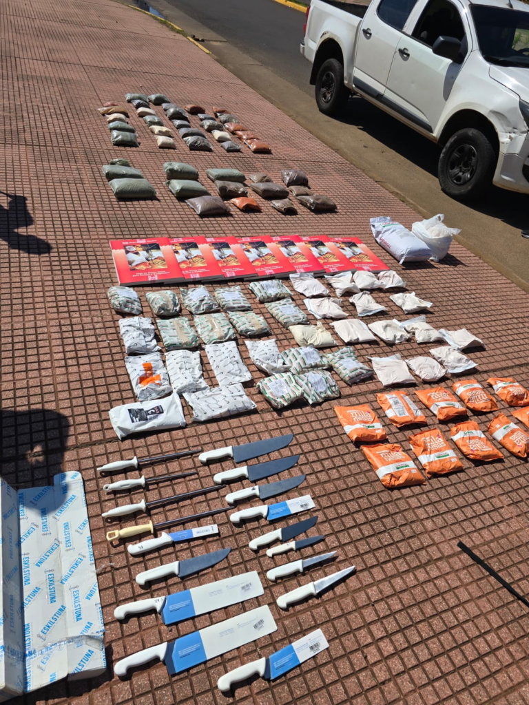 Durante el procedimiento se incautó además una bolsa de arpillera que contenía 42 paquetes de especias, discos y sierras para picar carne, 13 cuchillos carniceros, chairas y teléfonos celulares pertenecientes a los detenidos.