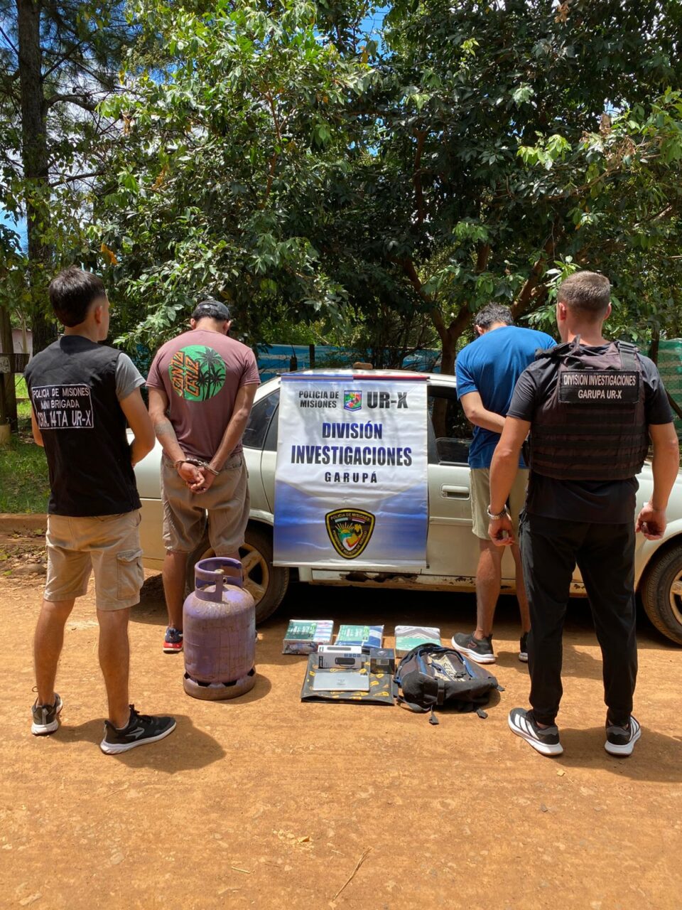 Luego de una recorrida preventiva, los investigadores localizaron a los implicados, quienes tenían en su poder una garrafa de 10 kilos, una mochila con tres juegos de sábanas, un reloj en caja sellada, un parlante de 100 watts en su embalaje original y una tablet.