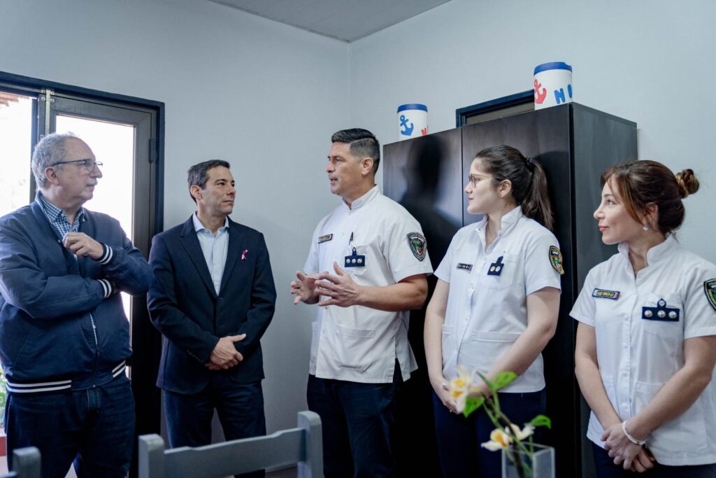 Acompañado por el ministro de Gobierno, Marcelo Pérez; el jefe de la Policía de Misiones, Sandro Martínez; y la inspectora a cargo del Nodo, Susana De Olivera, junto a otros integrantes de las áreas que operan en este espacio, Passalacqua observó el funcionamiento del sistema de videovigilancia articulado con el 911, dialogó con los equipos técnicos de la Policía Científica y del Cuartel de Bomberos, y visitó el consultorio médico donde se brinda atención clínica, pediátrica, psicológica y nutricional al personal policial.