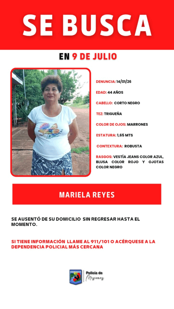 Persona desaparecida en 9 de Julio 15 enero, 202615 enero, 2026 Se solicita cualquier información sobre el paradero de Mariela Reyes