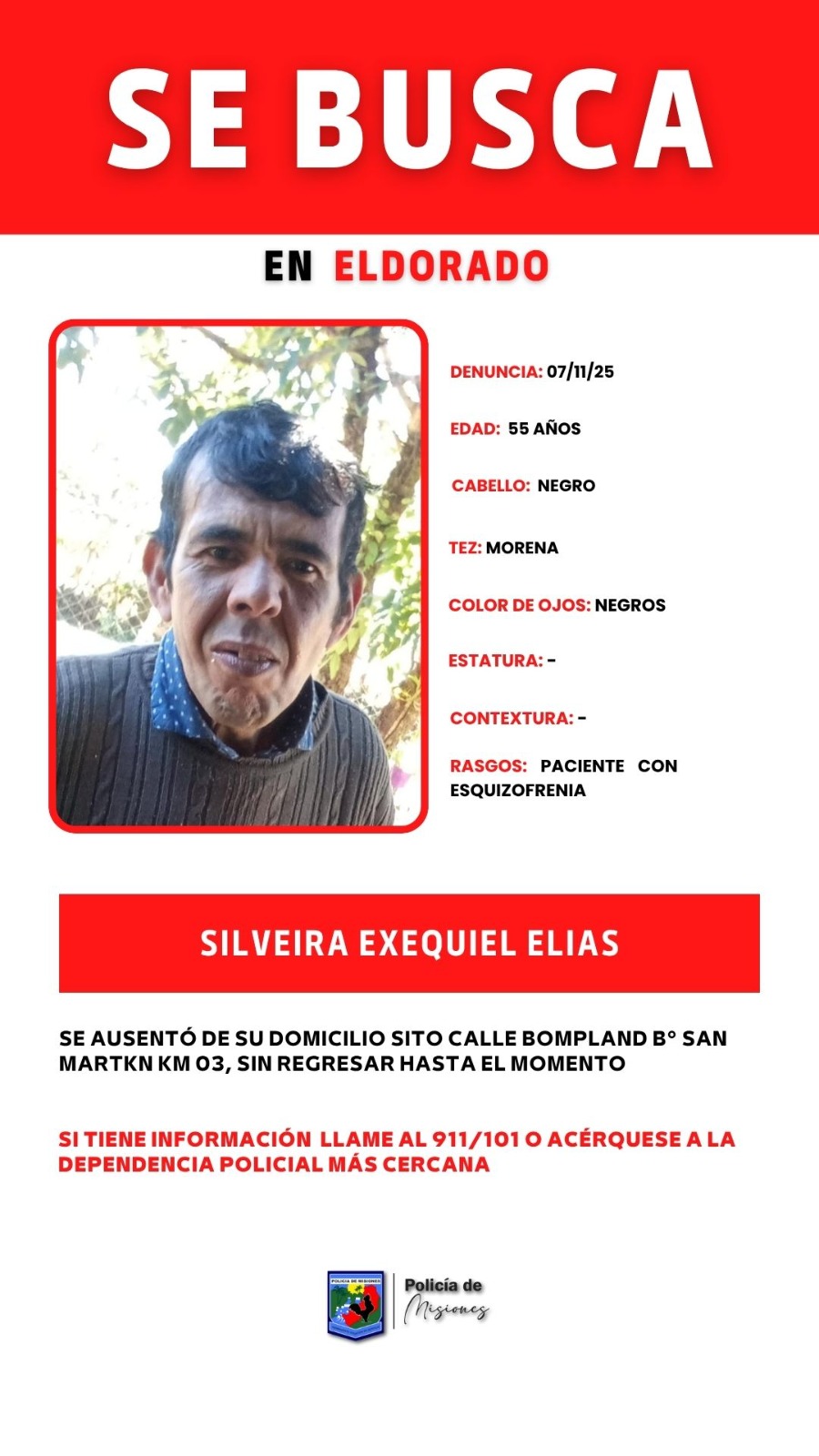 Persona desaparecida en Eldorado 7 noviembre, 20257 noviembre, 2025 Se solicita cualquier información sobre el paradero de Silveira Exequiel Elias