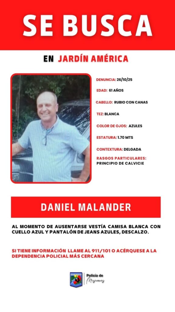 Persona desaparecida en Jardín América 26 octubre, 202526 octubre, 2025 Se solicita cualquier información sobre el paradero de Daniel Malander