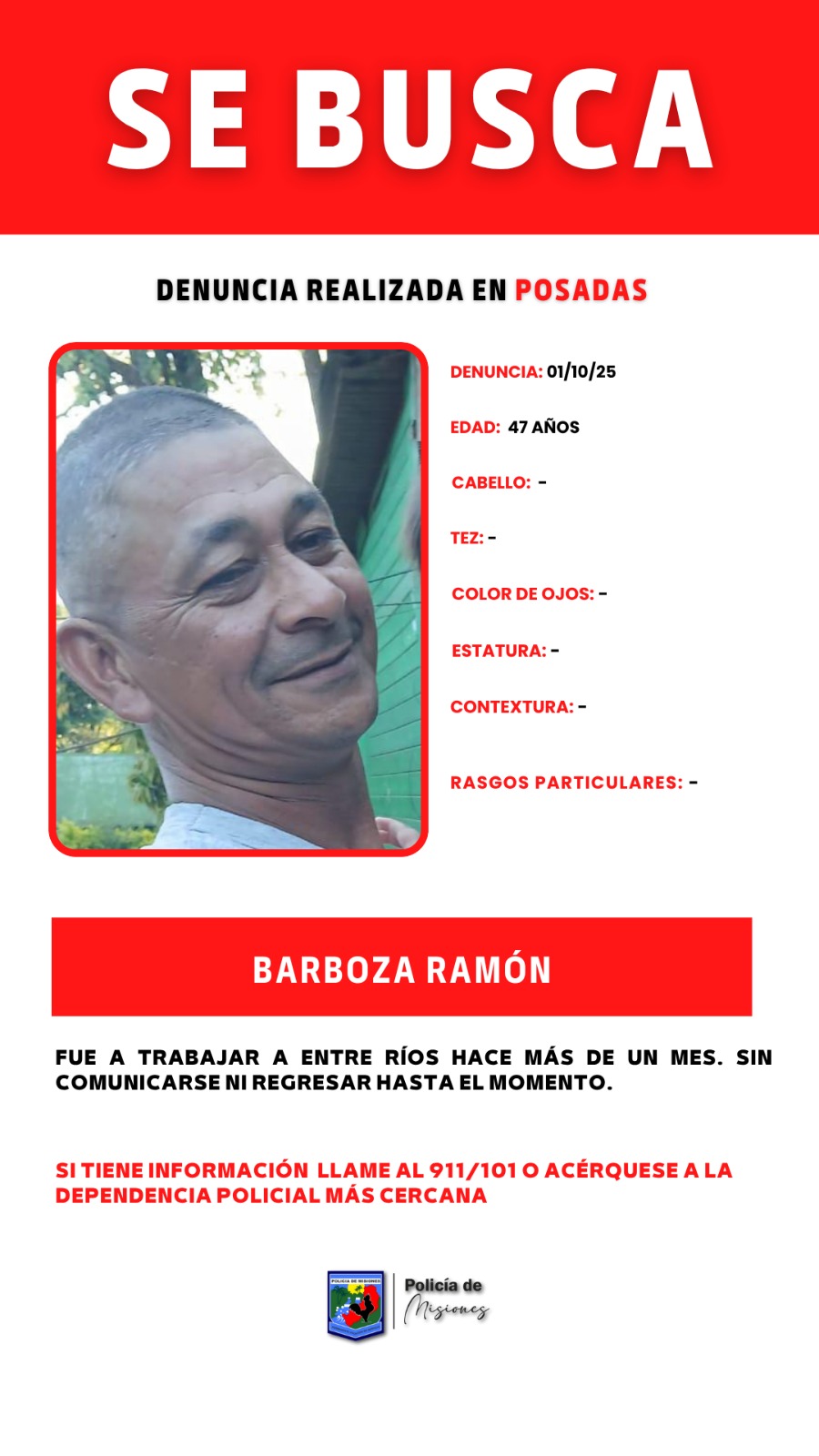 Persona desaparecida en Posadas 1 octubre, 20251 octubre, 2025 Se solicita cualquier información sobre el paradero de Barboza Ramón