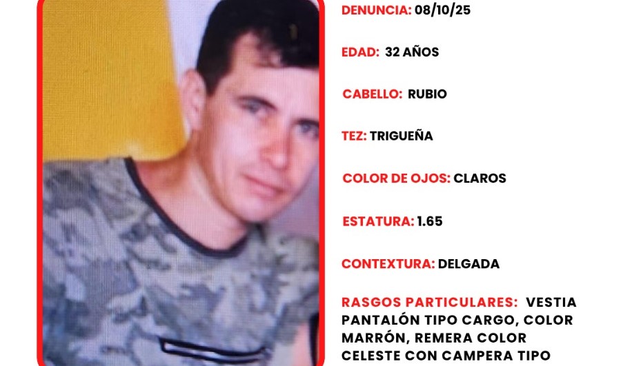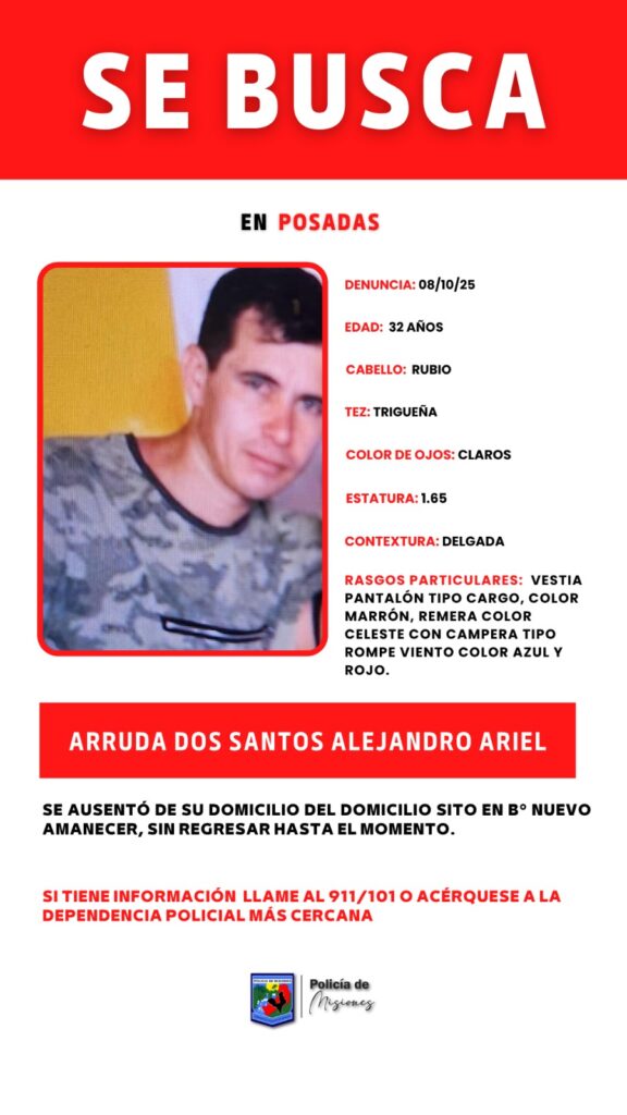Persona desaparecida en Posadas 8 octubre, 20258 octubre, 2025 Se solicita cualquier información sobre el paradero de Arruda Dos santos Alejandro Ariel