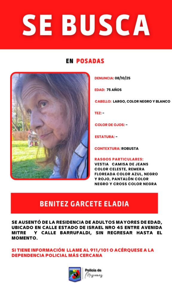Persona desaparecida en Posadas 8 octubre, 20258 octubre, 2025 Se solicita cualquier información sobre el paradero Benítez Garcete Eladia.