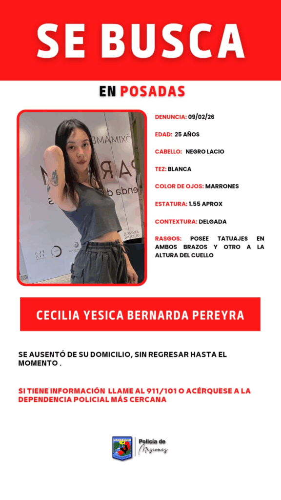 Persona desaparecida en Posadas 10 febrero, 202610 febrero, 2026 Se solicita cualquier información sobre el paradero de Cecilia Yesica Bernarda Pereyra