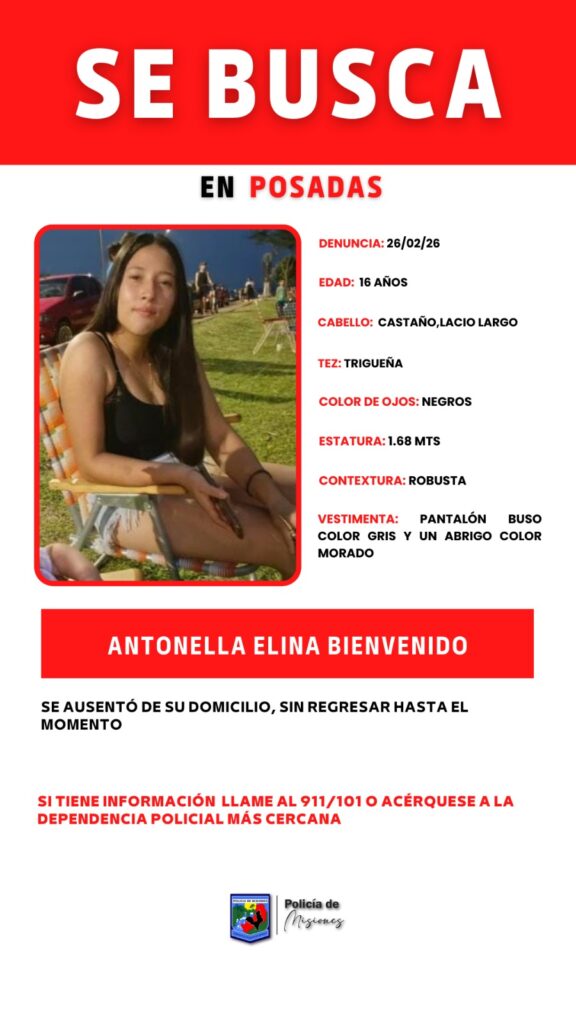 Persona desaparecida en Posadas 26 febrero, 202626 febrero, 2026 Se busca a Antonella Elina Bienvenido se ausento de su domicilio sin regresar hasta el momento cualquier información comunicarse al 911.