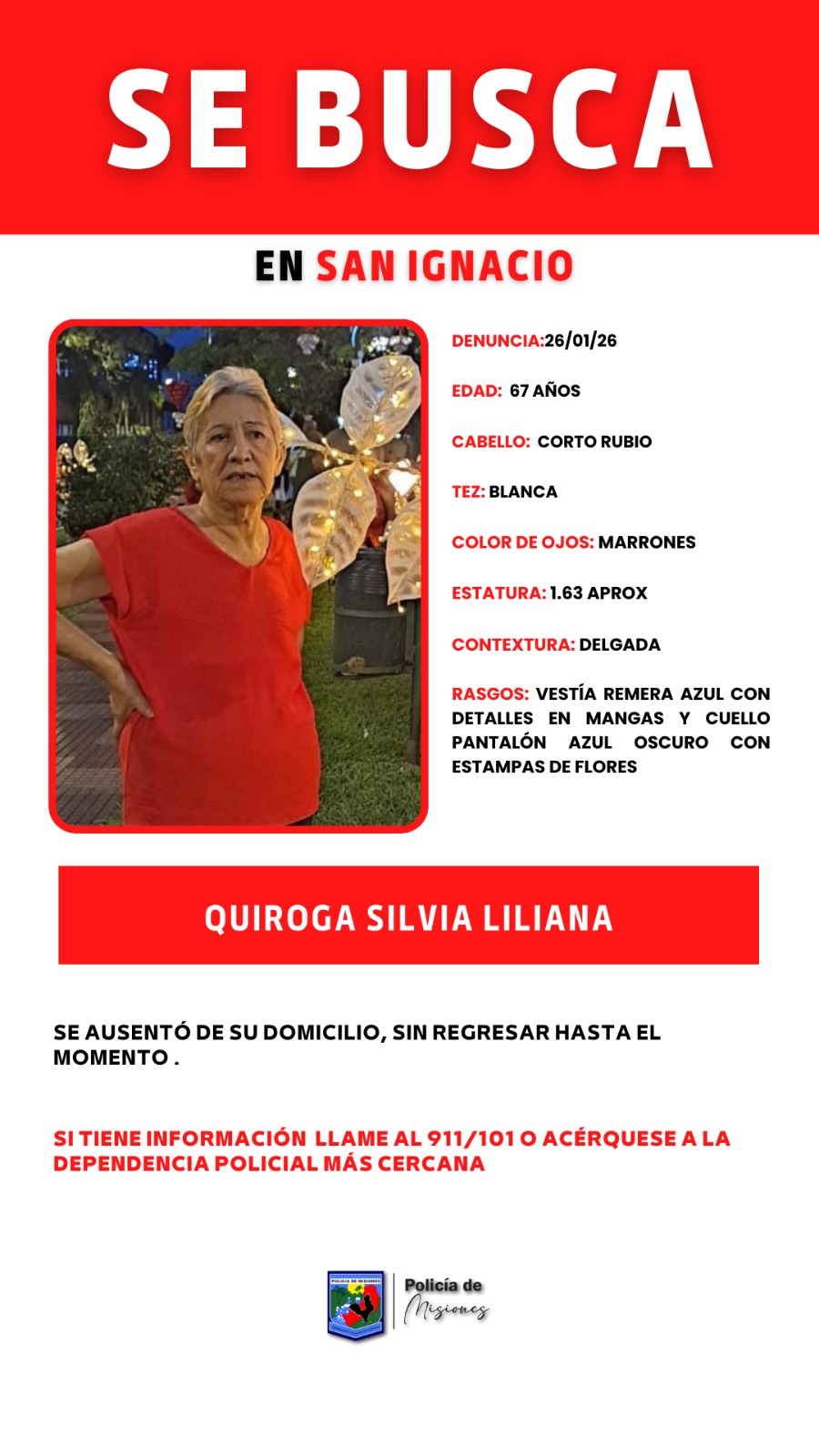 Persona desaparecida en San Ignacio 27 enero, 202627 enero, 2026 Se solicita cualquier información sobre el paradero de Silvia Liliana Quiroga
