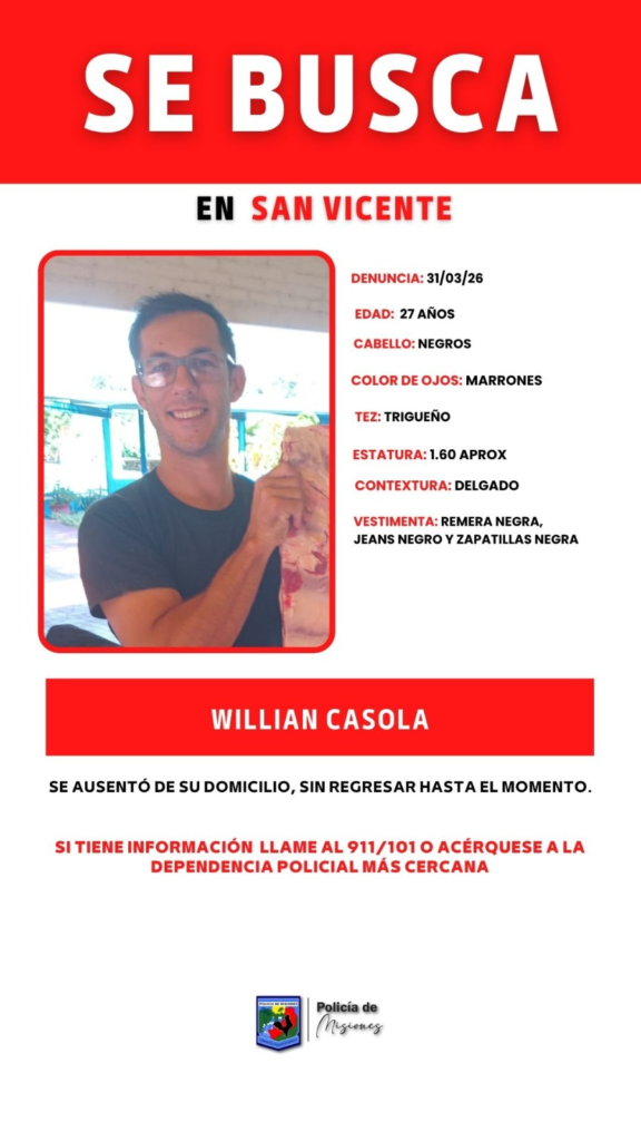 Se busca a Willian Casola se ausentó de su domicilio sin regresar hasta el momento cualquier información comunicarse al 911.