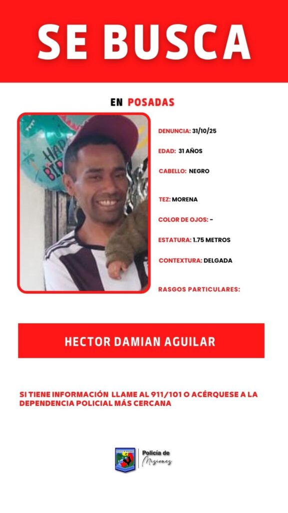 Persona desparecida en Posadas 31 octubre, 202531 octubre, 2025 Se solicita cualquier información sobre el paradero de Héctor Damián Aguilar