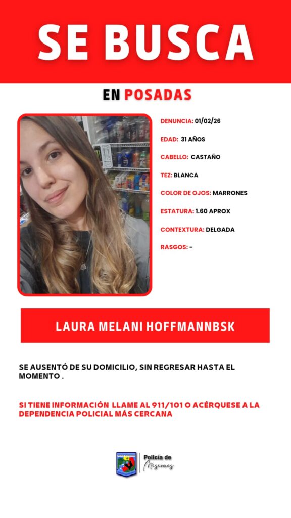 Persona desparecida en Posadas 1 febrero, 20261 febrero, 2026 Se solicita cualquier información sobre el paradero de Laura Melani Hoffmannbsk
