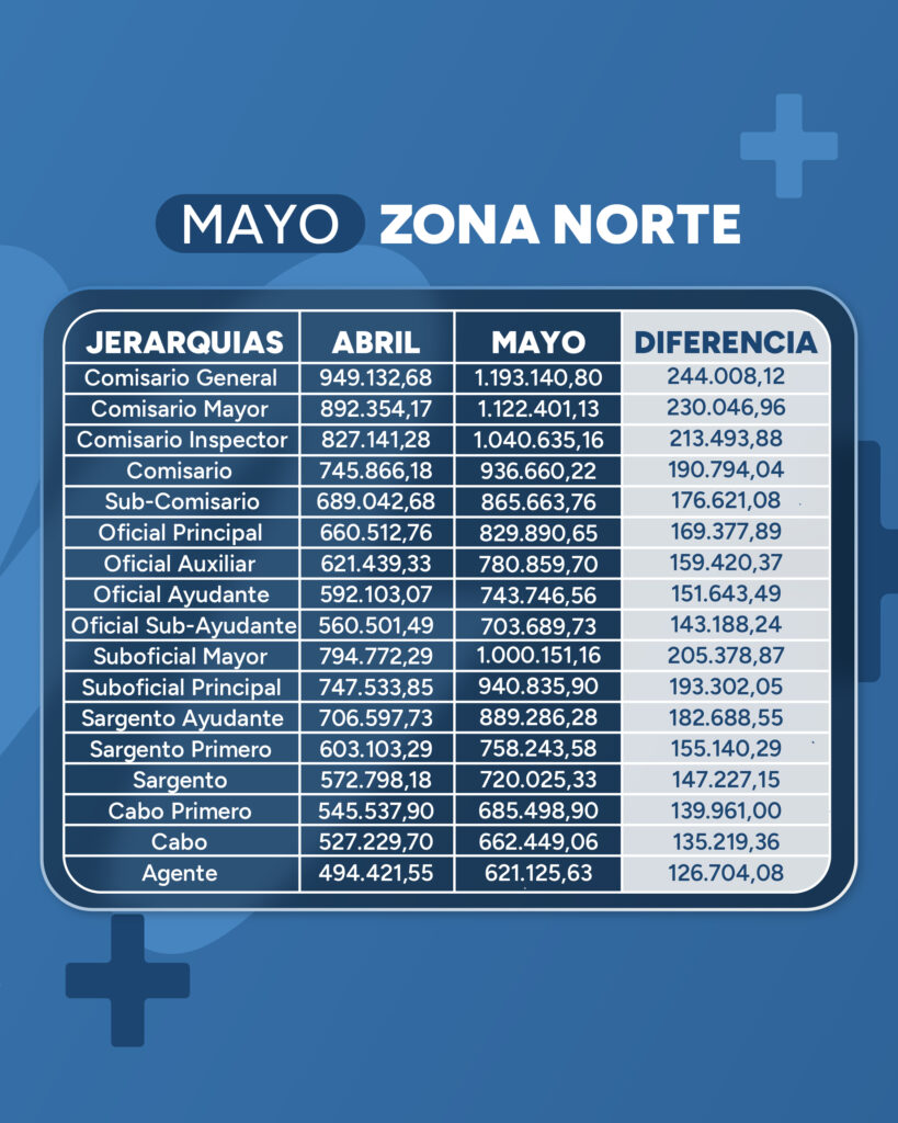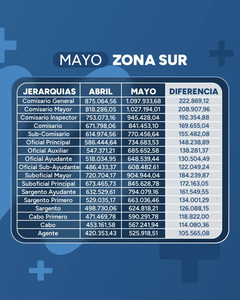 Otro ejemplo, en zona Sur, un Agente, en abril cobró $420.353,43, y en mayo cobrará $525.918,51, es decir hay una diferencia de $105.565,08. Mientras un Oficial Ayudante en abril cobró $518.034,95, en mayo cobrará $648.539,44, es decir una diferencia de $130.504,49. Y la categoría de Comisario General, pasó de $875.064,56 en abril a $1.097.933,68 en mayo, que es una diferencia de $222.869,12.