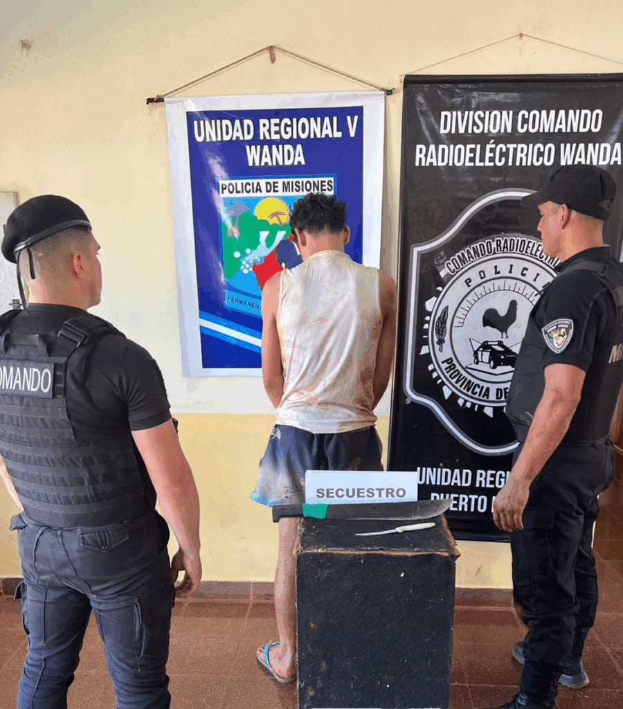 El primer hecho se registró el lunes a las 18:00 horas en el barrio Nueva Argentina de Wanda, donde Leandro D. (23) alias “Gordo”, fue detenido luego de que su hermana denunciara que había amenazado de muerte a su familia con un machete. Al llegar la Policía, el sujeto intentó agredir al personal con un arma blanca y huyó hacia un descampado, pero fue alcanzado tras una persecución a pie. En el procedimiento se secuestraron (01) machete y (01) cuchillo.