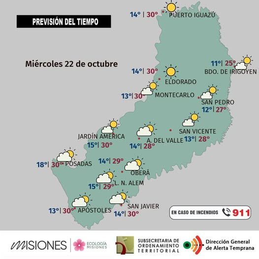 Temperaturas: máxima en la provincia estimada en 30 °C para Posadas; la mínima sería de 11 °C en Bdo de Irigoyen.