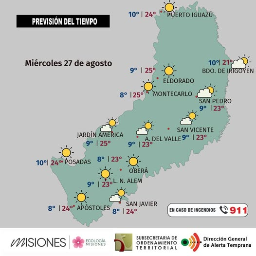 Temperaturas: máxima en la provincia estimada en 25 °C para Montecarlo, la mínima sería de 8 °C en Apóstoles con 7 °C de sensación térmica.