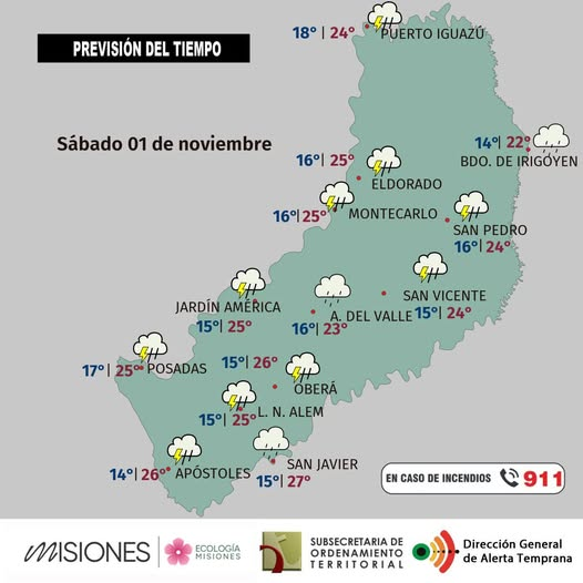 Temperaturas: máxima en la provincia estimada en 27 °C para San Javier, la mínima sería de 14 °C en Apóstoles.
