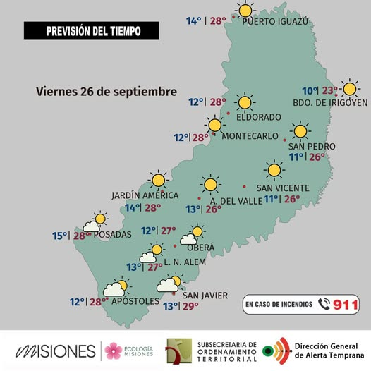 Temperaturas: máxima en la provincia estimada en 29 °C para San Javier, la mínima sería de 10 °C para Bernardo de Irigoyen con 8 °C de sensación térmica.