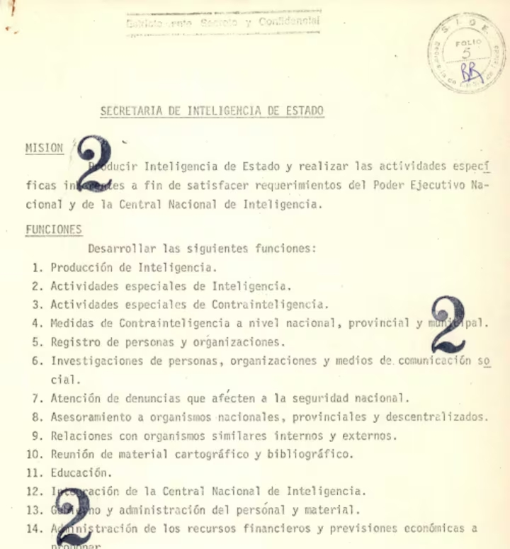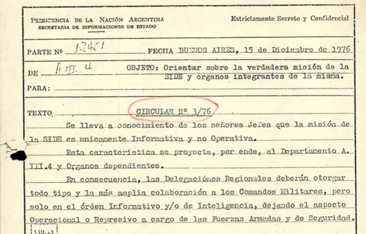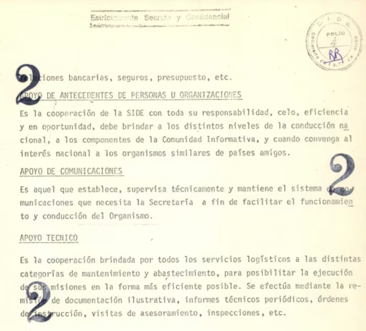 No todos los archivos abonan esa línea argumental. Otro documento, incluido en un manual de funcionamiento de las regionales de la SIDE, señala que los espías sólo tienen misiones informativas y no operativas, “dejando el aspecto operacional o represivo a cargo de las Fuerzas Armadas y de Seguridad”.
