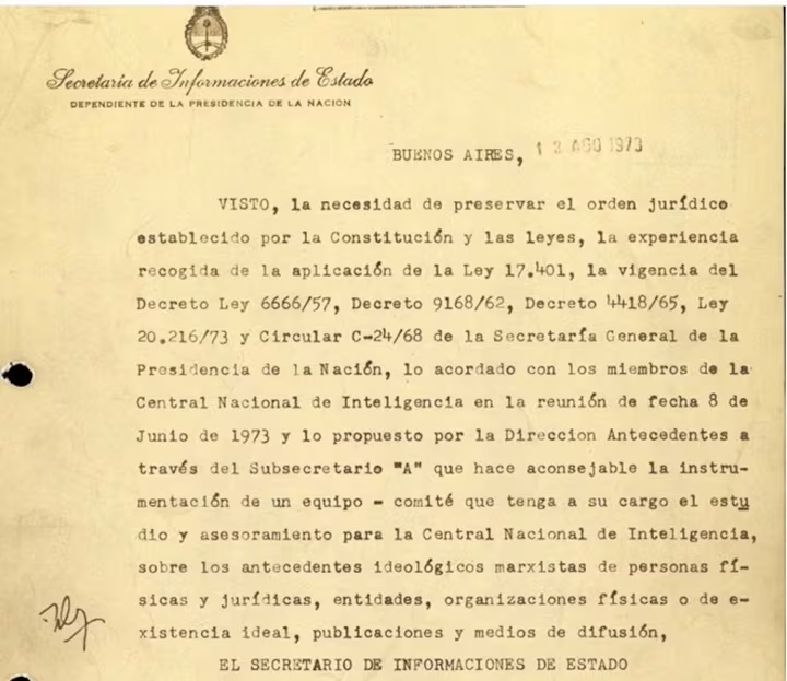 Hay otros que muestran un interés en instalar que la persecución a la izquierda no comenzó en 1976 --algo que hace décadas es denunciado por organismos de derechos humanos. Por ejemplo, figura una resolución de agosto de 1973 que crea una comisión asesora de la Central Nacional de Inteligencia (CNI), que tenía a su cargo “el estudio de los antecedentes ideológicos marxistas de personas físicas o de existencia ideal, organizaciones, publicaciones y medios de difusión”.