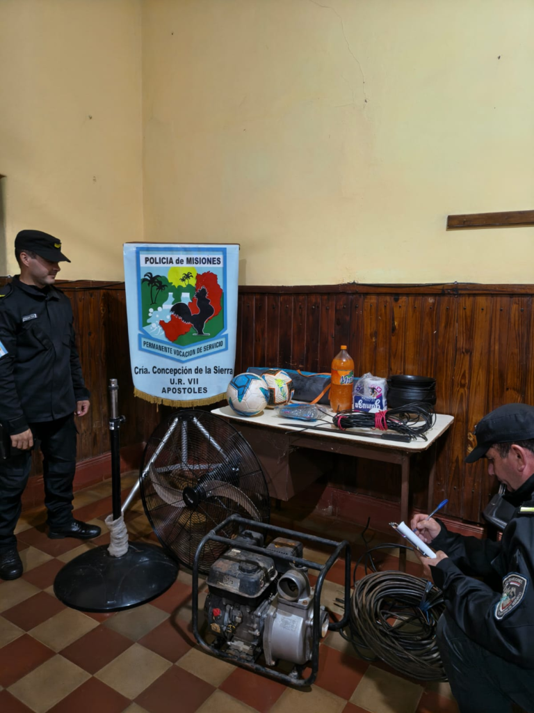A partir de tareas investigativas realizadas por efectivos de la Unidad Regional VII, se logró recuperar parte de los objetos sustraídos, entre ellos una bomba de agua, machetes, una olla de hierro, un ventilador industrial, una carpa, pelotas, cableado y otros elementos que fueron reconocidos por el denunciante.