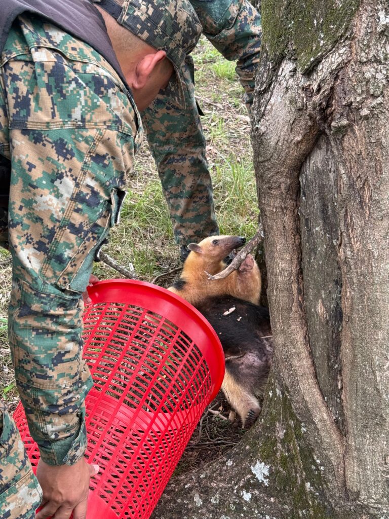 En el lugar, los efectivos procedieron al rescate de un ejemplar de oso melero (Tamandua tetradactyla), que fue resguardado y posteriormente examinado por un profesional veterinario. Tras constatar su estado sanitario, se dispuso su entrega a personal de Fauna Silvestre para su posterior liberación en un entorno natural adecuado.