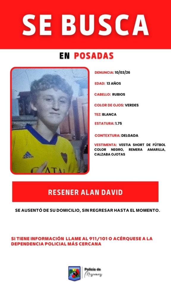 Se busca a un adolescente en Posadas 10 marzo, 202610 marzo, 2026 Resener Alan David, se ausentó de su domicilio sin regresar hasta el momento, cualquier información acercarse a la seccional más cercana o comunicarse al 911.