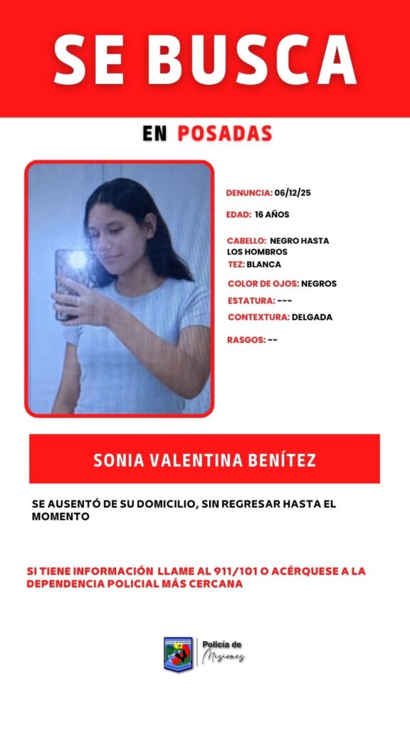 Sonia Valentina Benítez despareció el día 6 de diciembre, se solicita cualquier información comunicarse a la dependencia policial mas cercana.