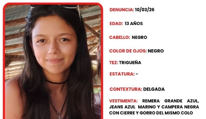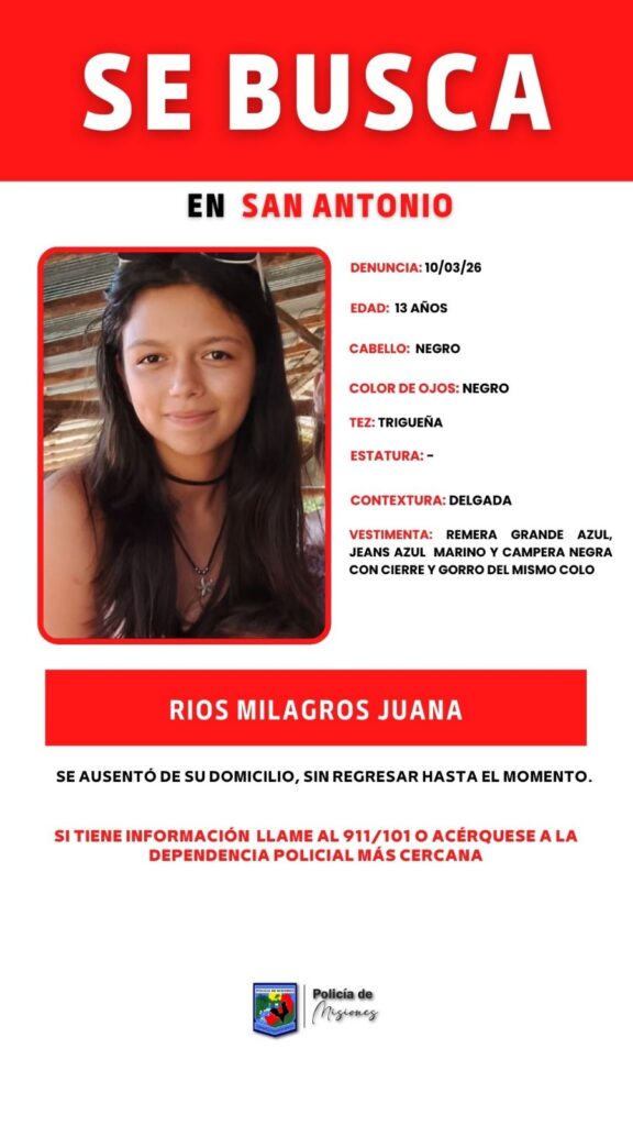 Se busca a una adolescente en San Antonio 11 marzo, 202611 marzo, 2026 Ríos Milagros Juana se ausento de su domicilio sin regresar hasta el momento, cualquier información acercarse a la seccional más cercana o comunicarse al 911.