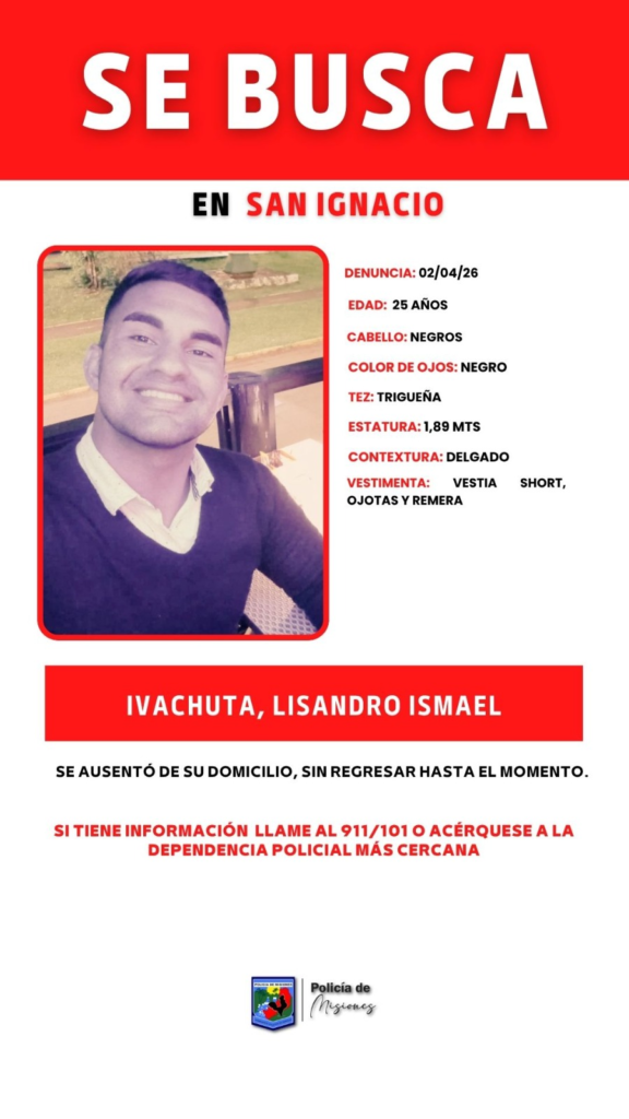 Ivachuta Lisandro Ismael se ausentó de su domicilio sin regresar hasta el momento, cualquier información comunicarse al 911.